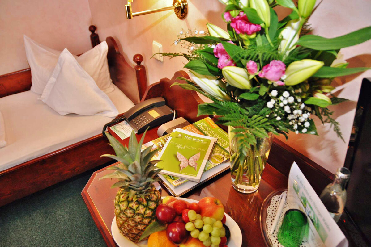 Unsere Gästezimmer verfügen über Telefon, TV, Dusche, WC, teilweise Balkon und machen selbst den längeren Aufenthalt zum Vergnügen. Wer einen Rückzugsort der besonderen Art sucht, kann in unserem Ferienhaus im Hotelgarten übernachten.