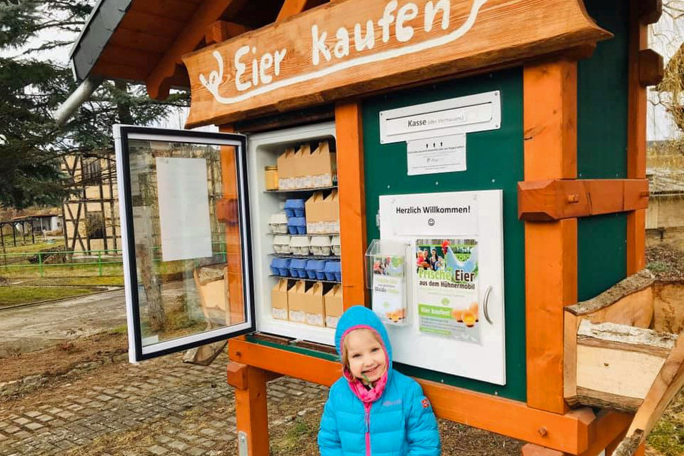 Durch unseren SB-Eierkühlschrank ist es möglich, ständig tagesfrische Eier von glücklichen Hühnern zu erwerben.