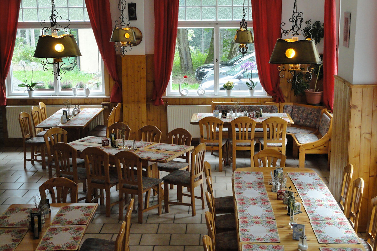 In unseren Gasträumen verwöhnen wir Sie mit frisch zubereiteten Thüringer Gerichten und leckeren Kuchen. Hier können Sie sich gemütlich von Ihren Wanderungen ausruhen (im Winter manchmal auch am Kamin) oder in den Sommermonaten auf der Terrasse die umliegende Natur und unsere "Oase der Ruhe" genießen.