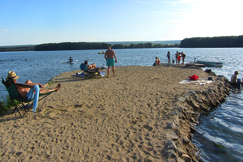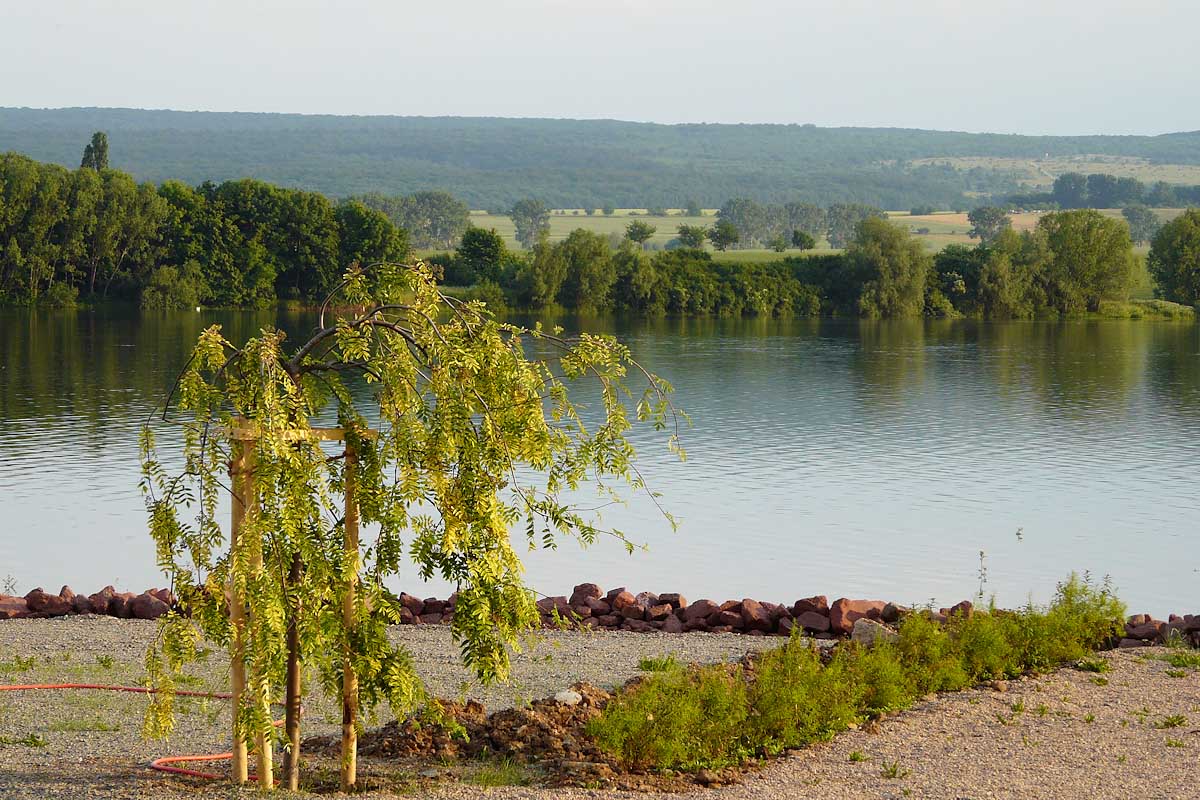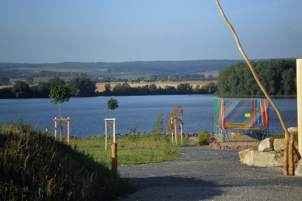 Ich sitze hier also am Strand von Thüringen, mitten in Deutschland - Luftlinie nicht mehr als 1 km vom geografischen Mittelpunkt Deutschlands entfernt. Alles grün. Tür an Tür mit der Natur. Und so eine Stille. Vogelgezwitscher, Fröschequaken, see-eigene Schwäne und ein paar Fische, die ihren Wassertanz aufführen. Herrlich.