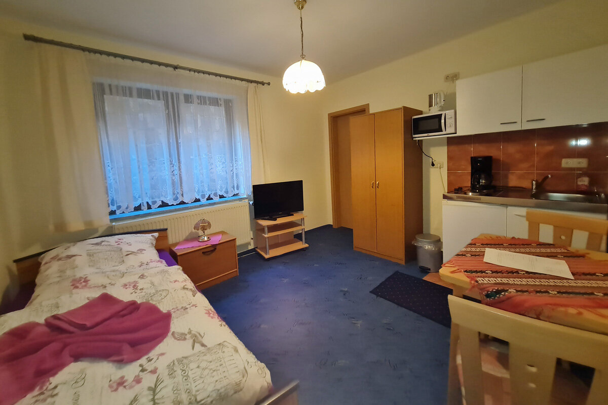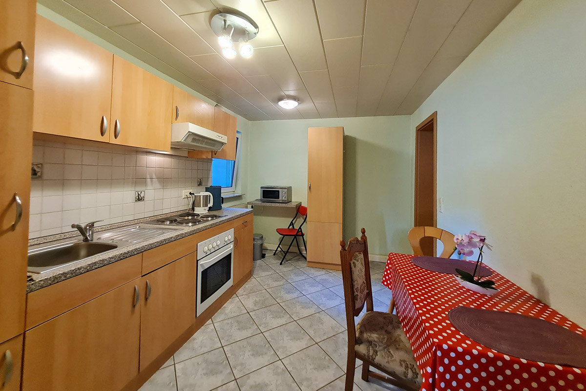 Eine kleine Ferienwohnung für bis zu 3 Personen verfügt neben einem kombinierten Wohn-und Schlafzimmer über eine separate Einbauküche mit Esstisch.