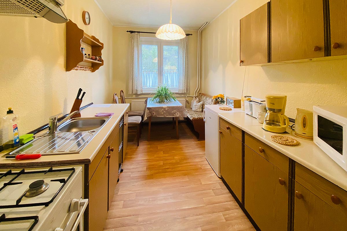 Wir bieten Ihnen eine Ferienwohnung mit 2 Schlafzimmern, Küche (mit Kühlschrank u. Gasherd, Toaster, Kaffeemaschine, Wasserkocher, Eierkocher), Dusche/WC, TV, Bettwäsche + Handtücher vorhanden sowie einen PKW-Stellplatz und Sitzmöglichkeiten im Garten.