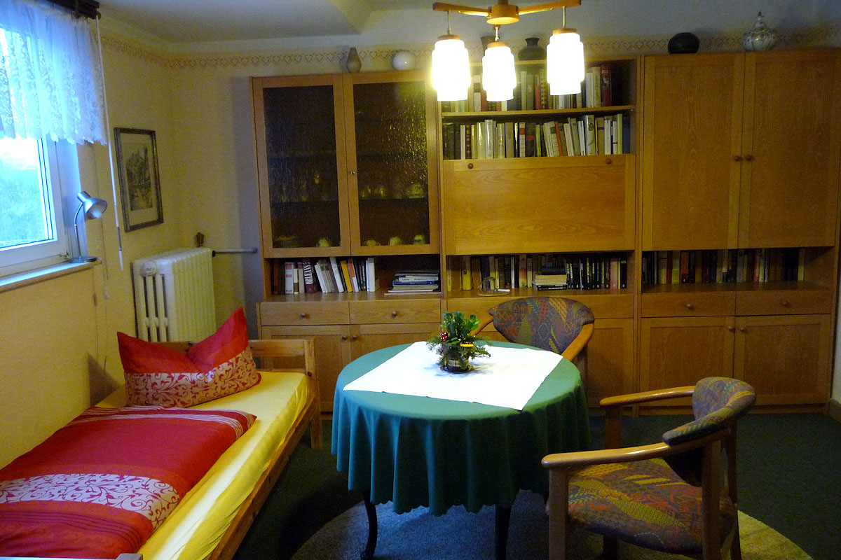 Im EG befindet sich eine kleine gemütliche Ferienwohnung mit speparaten Eingang, Dusche/WC, einem französichen Bett, einer Essecke sowie der Möglichkeit der Gartennutzung und einem eigenen Autostellplatz. Diese Ferienwohnung verfügt allerdings über keine Küche, so dass Sie sich hier nur Ihr Frühstück und kaltes Abendbrot bereiten können. Ausreichend Gläser und Geschirr sowie ein Wasserkocher sind natürlich vorhanden. Sie bietet sich ideal für Paare oder Alleinreisende an, die aktiv den ganzen Tag unterwegs sind und dann auch die abwechslungsreiche Jenaer Gastronomie für sich entdecken wollen.