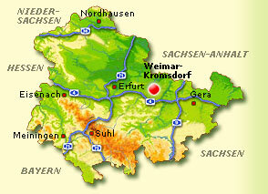 Sie erreichen uns über die Autobahn A4 (Abfahrt Apolda) in Richtung Apolda. An der Ampelkreuzung Umpferstedt links in Richtung Weimar auf der B7 einordnen. Ca. 3 Kilometer nach der Ampelkreuzung rechts in das Gewerbegebiet Süßenborn fahren, dieses ganz durchfahren und immer der Hauptstraße folgen. Im Ort Süßenborn links halten, nächste Ortschaft ist Kromsdorf und Sie sind am Ziel.