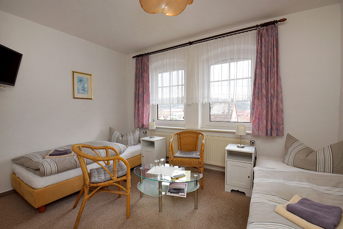 Es erwarten Sie 13 geschmackvoll und individuell eingerichtete Gästezimmer, teilweise mit Blick zur Wartburg, zum Burschenschaftsdenkmal und über Eisenach.