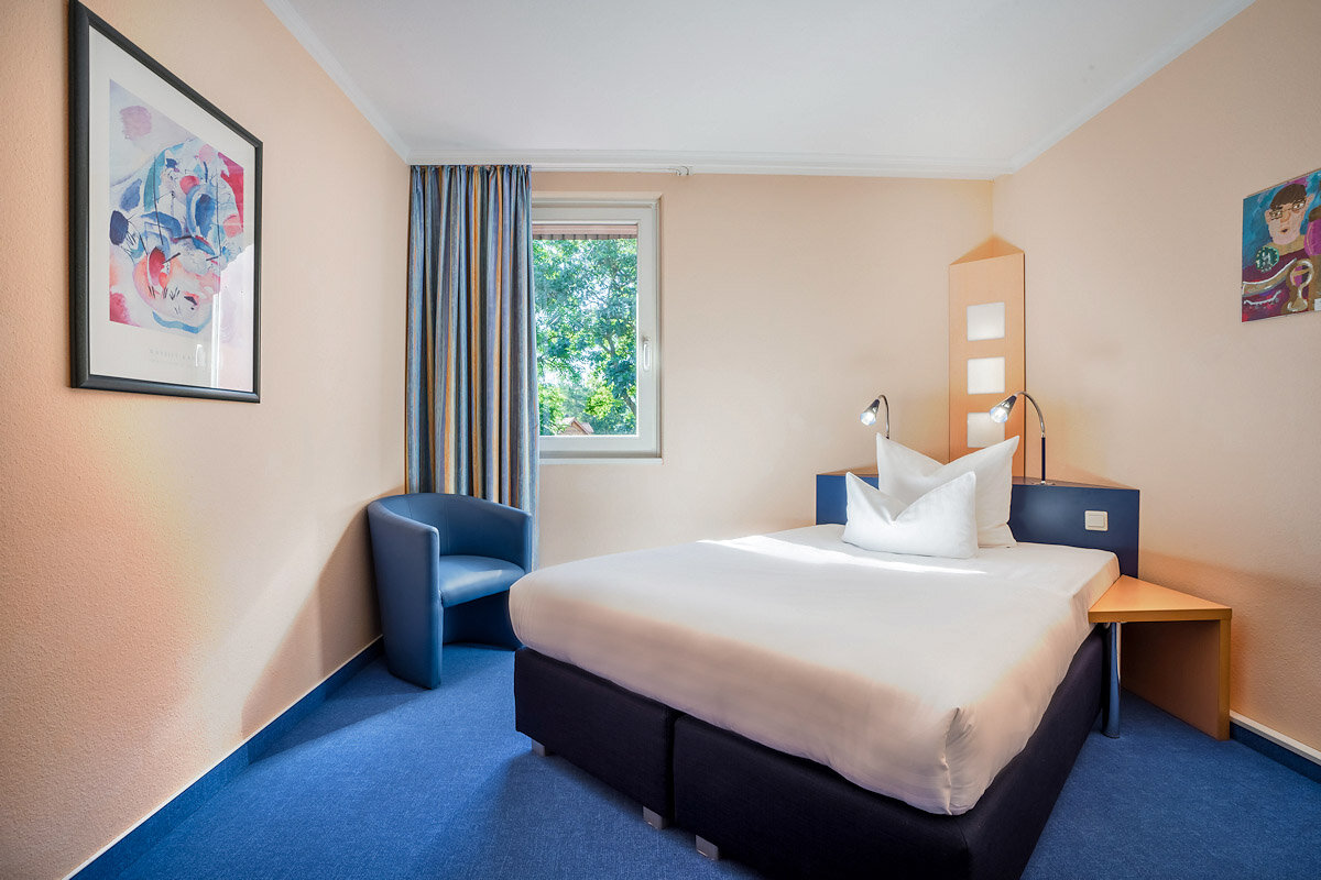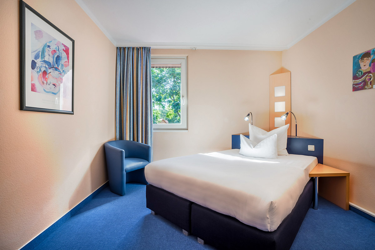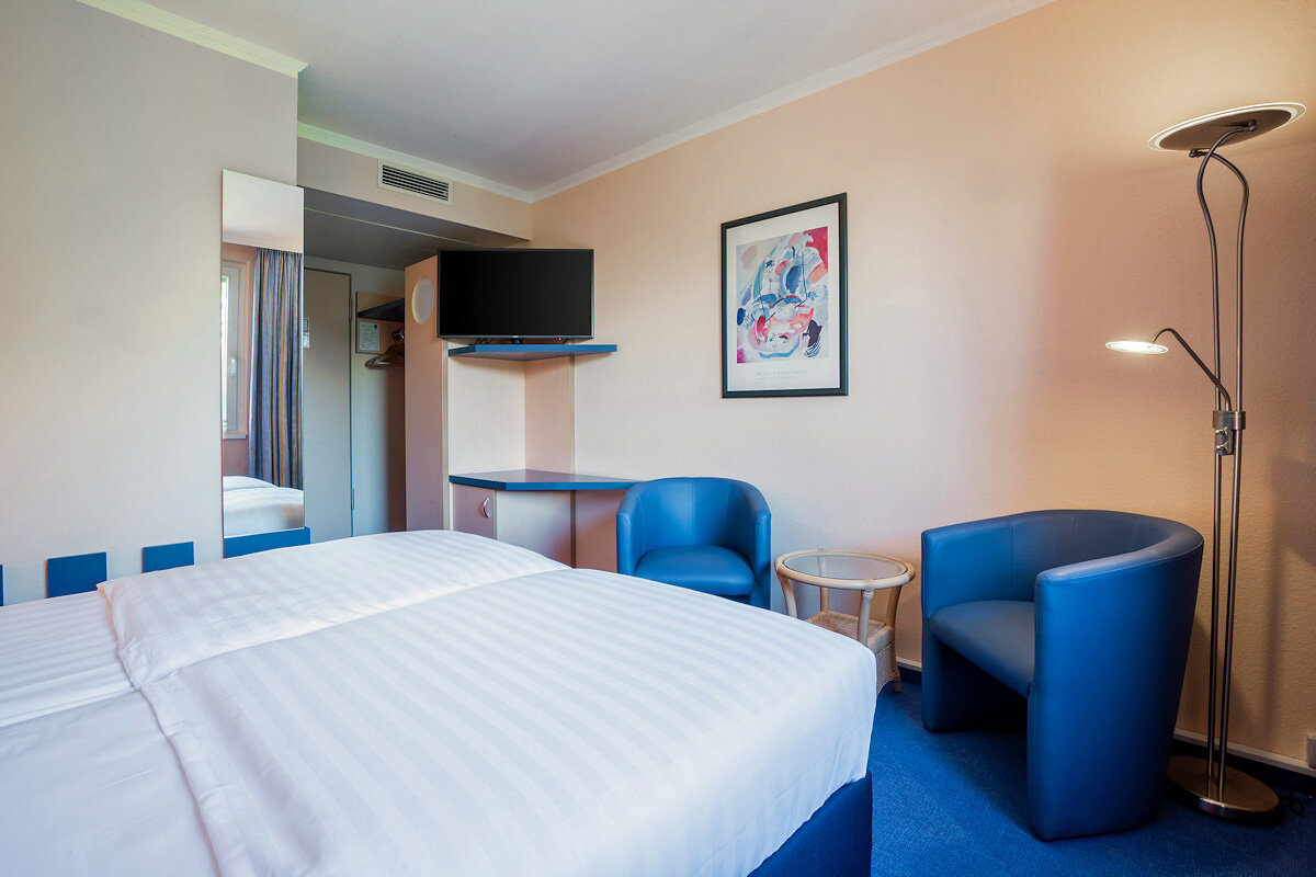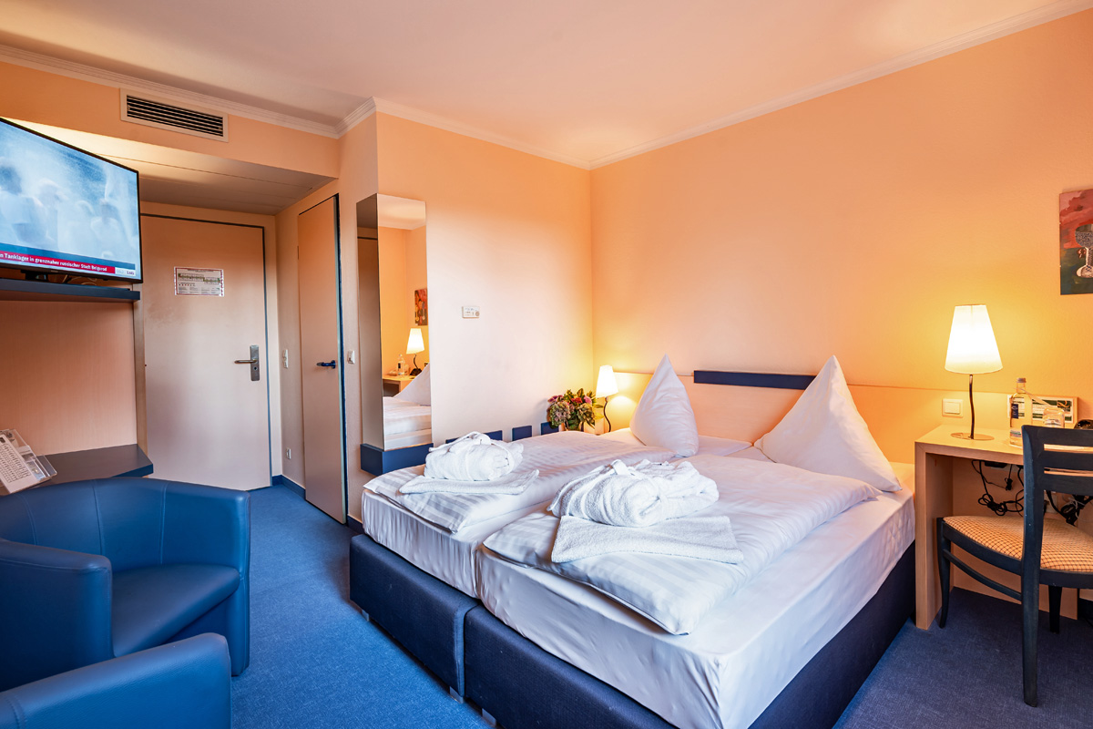 Unser Hotel verfügt über 118 komfortable Zimmer, davon 116 für Nichtraucher und 1 behindertengerechtes. Alle Zimmer sind klimatisiert, schallschutzisoliert und ausgestattet mit Dusche/WC, Fön, Sat-TV, Highspeed-Internet, Radio, Telefon und Schreibtisch.