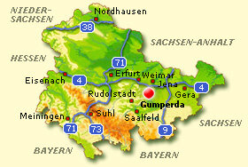 An der ersten Ampel am Ortseingangsschild "Kahla" weiter geradeaus. An der nächsten Ampel (in der Senke) rechts abfahren, durch die Orte Bibra, Gumperda bis zum Abzweig nach Röttelmisch.