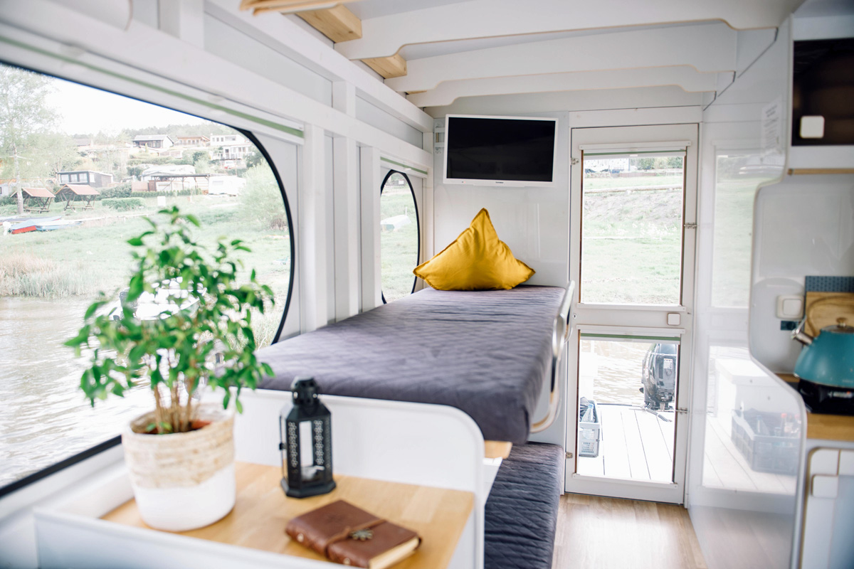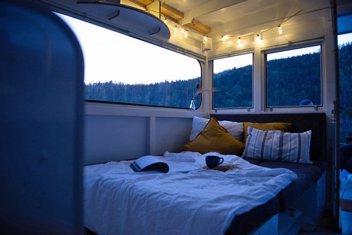 Die Innenausstattung unserer beiden Hausboote besitzt alles, was man an Bord für einen perfekten Aufenthalt benötigt. Ob Frühstück auf der Terrasse, Yoga auf dem Sonnendeck oder einem Glas Wein unter freiem Sternenhimmel... Kommen Sie in den Genuss des vollkommen autark ausgestatteten Hausbootes und lassen Sie sich treiben.