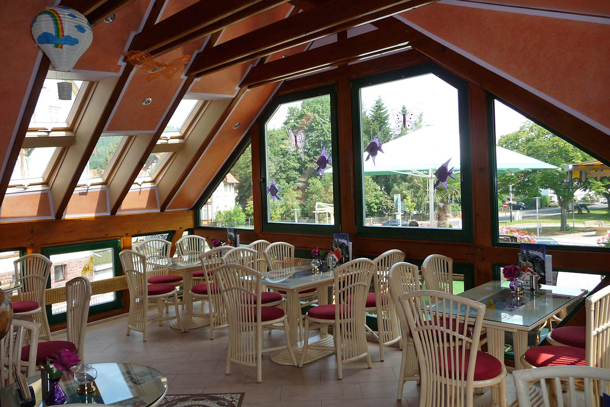 Das ganzjährig geöffnete Terrassencafé liegt im Herzen von Georgenthal und bietet auf der Terrasse für 26 Personen sowie im verglasten Wintergarten für 35 Personen Platz. Mit viel Liebe zum Detail wurde der gesamte Außen- und Innenbereich begrünt und dekoriert und so zu einem individuellen Ort der Entspannung gestaltet. Selbstverständlich, dass dabei auch besonders auf Kinderfreundlichkeit geachtet wurde: Wickeltisch, Kinderstühle und Kinderbank sind vorhanden.