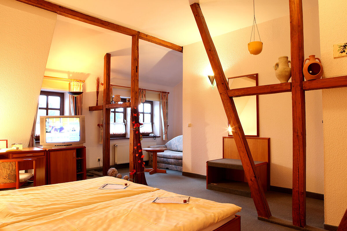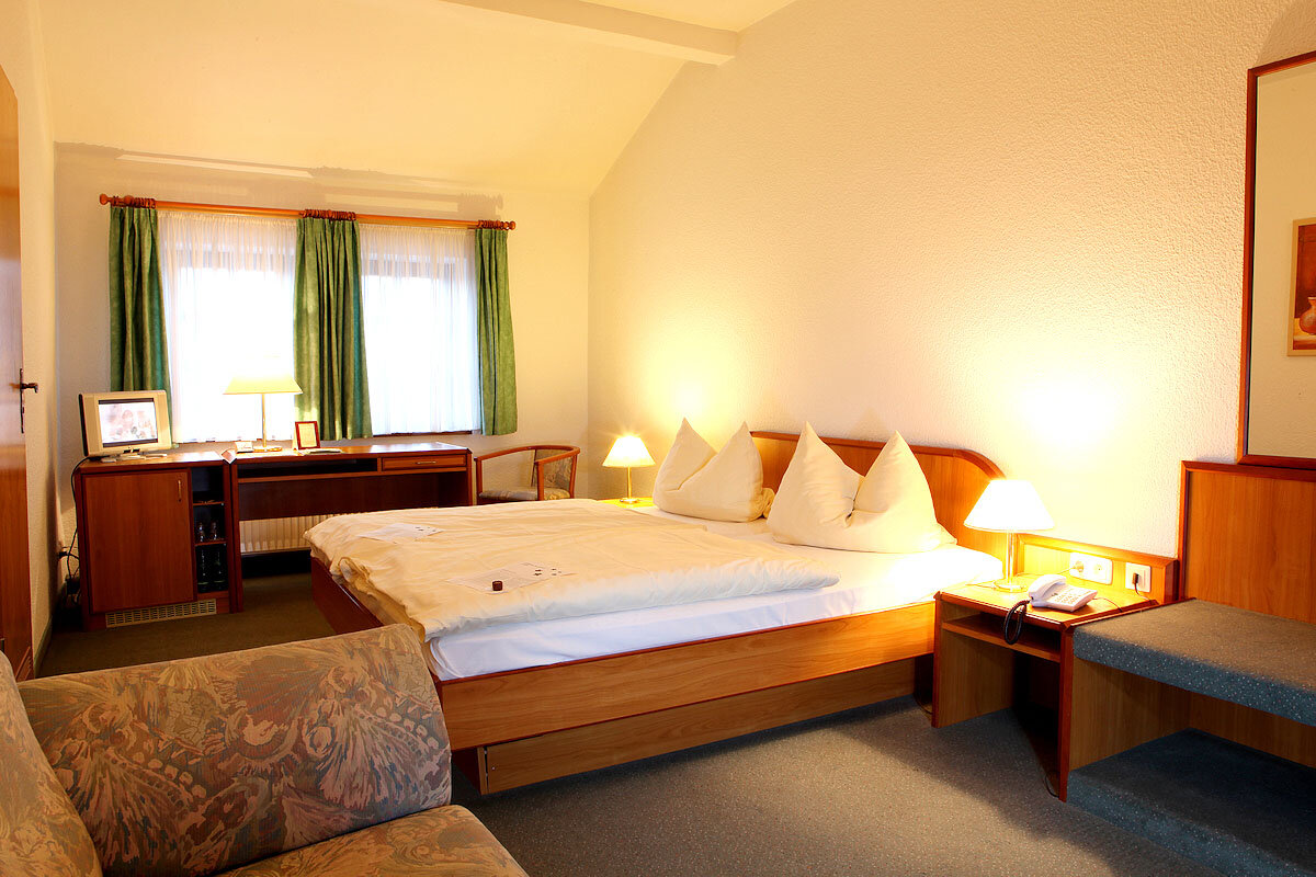 Unser Haus verfügt über eine Pension mit Platz für bis zu 10 Personen. Die Gästezimmer sind geräumig und gemütlich ausgestattet mit Doppel- oder Einzelbetten, Dusche/WC und Sat-TV. Kostenfreie W-LAN Nutzung ist selbstverständlich. Hunde sind gegen einen Aufpreis erlaubt. Im Sommer laden zwei gemütliche Biergärten zum Verweilen ein. Ein großer Parkplatz (250 Plätze) steht unseren Gästen kostenfrei zur Verfügung