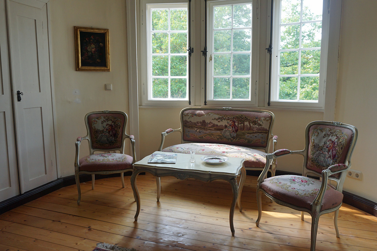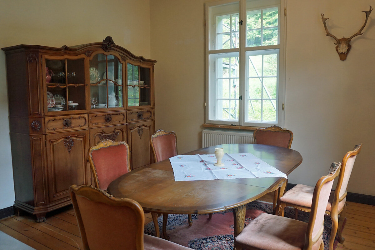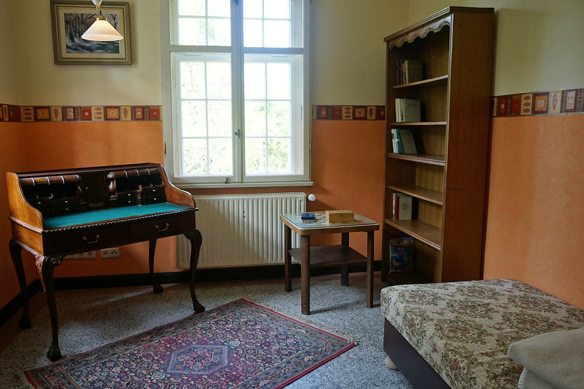Im Erdgeschoss: Küche, Speisekammer und Duschbad, Esszimmer mit Kaminofen, Wohnzimmer und Arbeitszimmer mit kleiner Bibliothek, Liege und Spieltisch.