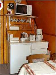 im EG: großer Wohnraum mit ausziehbarer Eckcouch (auch zum Schlafen für 2 weitere Personen geeignet) und Zugang zum Gartenbereich, Kamin und Elektroheizung, TV und Radio; Küche mit EBK und Esstisch (Kaffeemaschine, Mikrowelle, 4-Platten-Elekroherd, Toaster, Wasserkocher, ausreichend Geschirr und Gläser); Bad mit Dusche, WC, Waschbecken