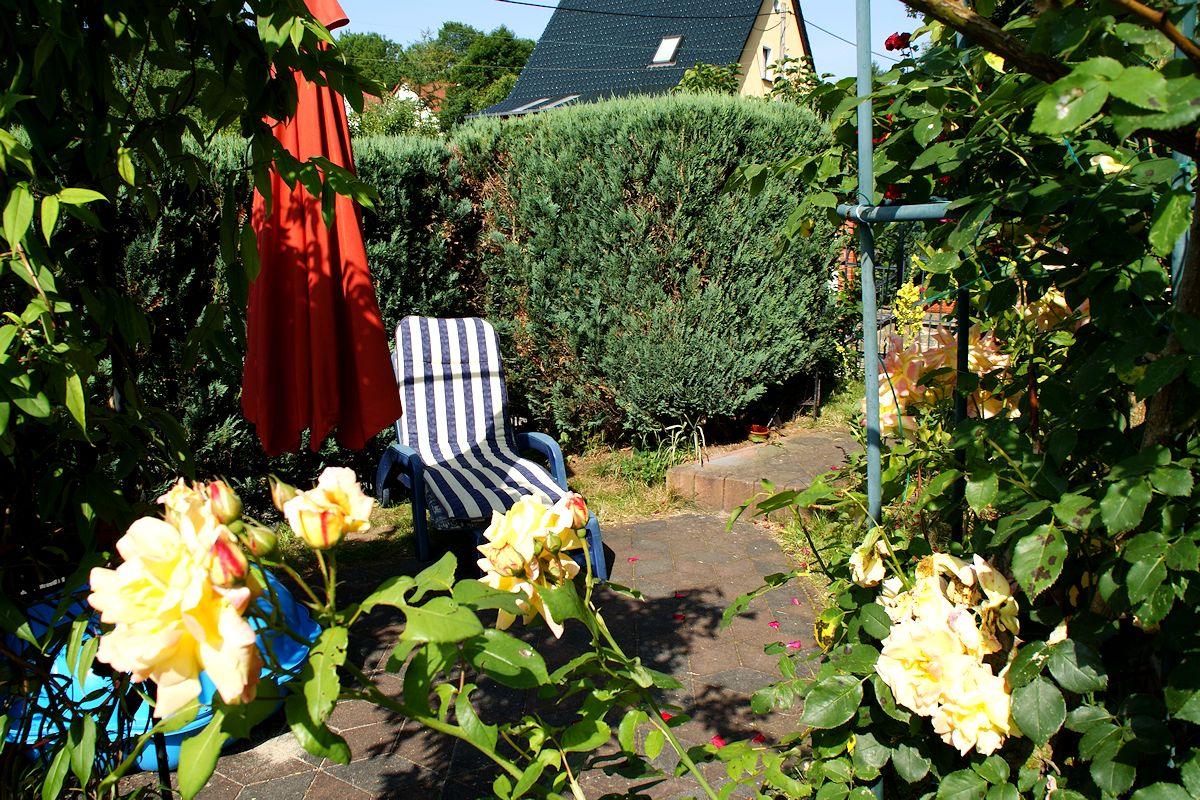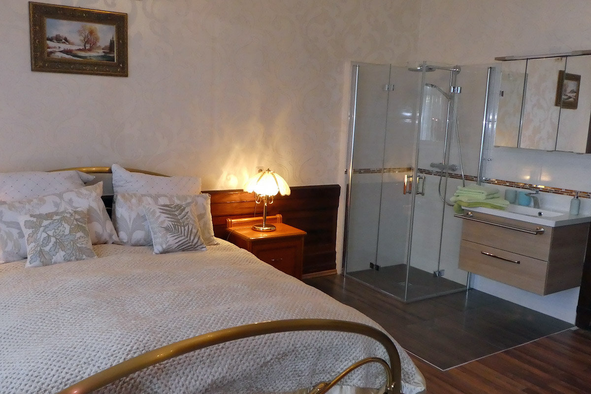 Ihr Doppelzimmer mit Miniküche und Dusche/WC ist hochwertig und modern ausgestattet und von einem romantischen Garten mit Sitzplatz umgeben.