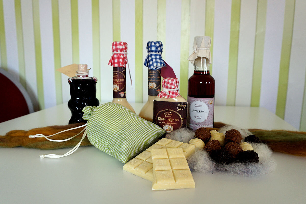 Bei Selbstverpflegung finden Sie in unserem Hofladen zahlreiche leckere, liebevoll hausgemachte Produkte aus Wachteleiern, wie z. B. Wachtel-Eierliköre, oder Wachtel-Eierlikör-Trüffelpralinen, leckere Marmeladen und Sirupe, Kräuterprodukte sowie Getreide & Mehle und vieles mehr.