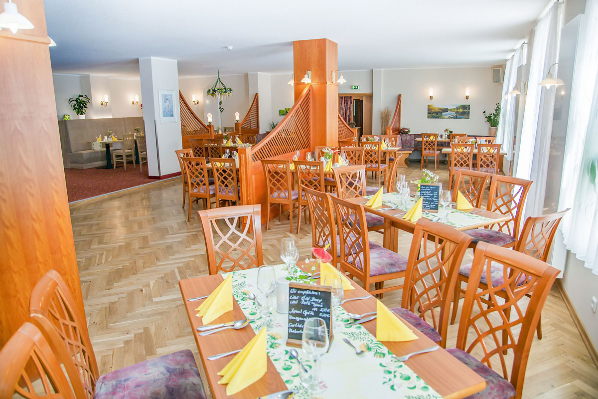 Ruhe beim Frühstück finden Sie im Restaurant "Parkblick" mit 60 Plätzen und herrlichen Ausblick in den Park.