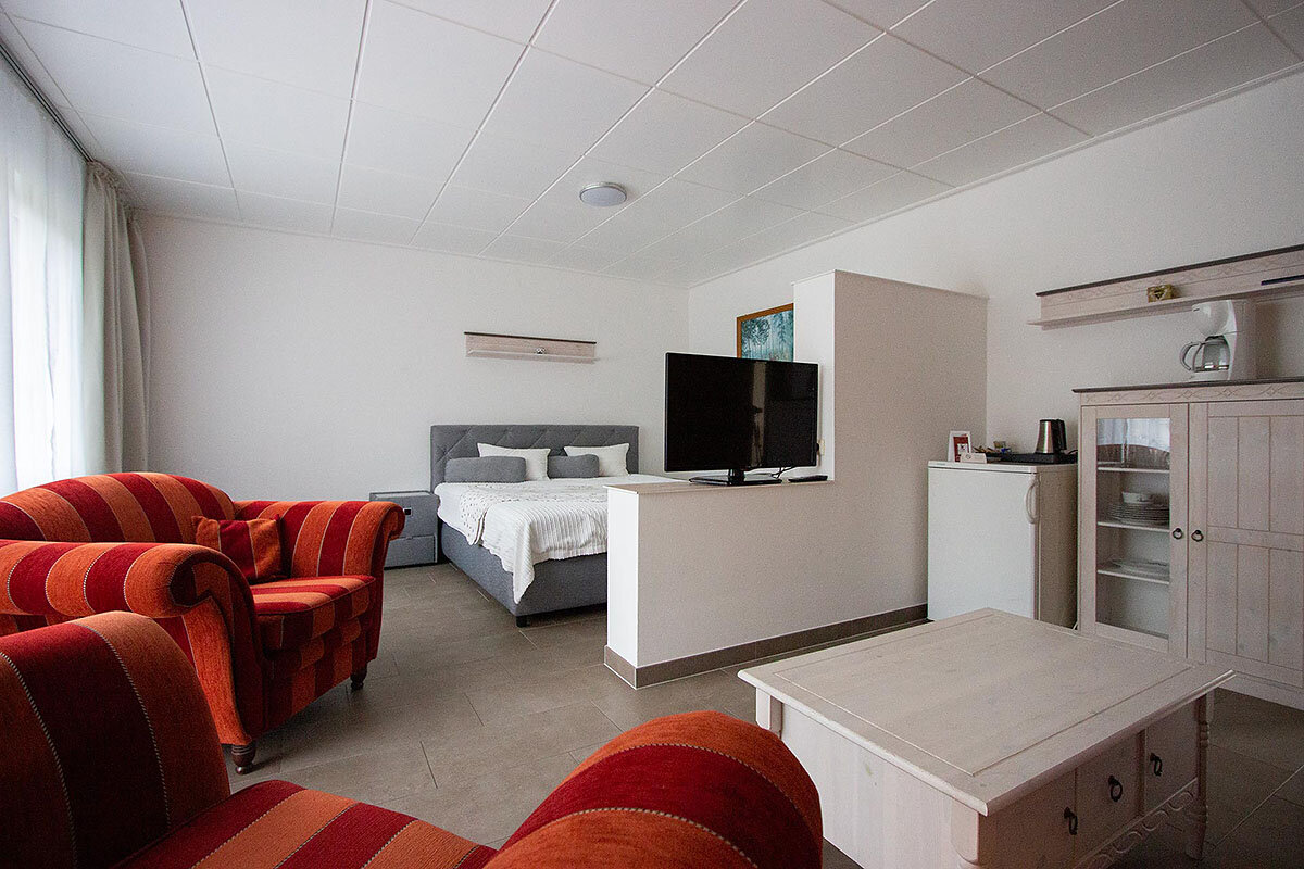Die Appartements im Gästehaus setzen sich ebenfalls aus getrennten Schlafräumen, Badezimmer und separatem Wohnzimmer zusammen und sind jeweils separat begehbar. Außerdem verfügen 2 Appartements ebenfalls über eine Sonnenterrasse.