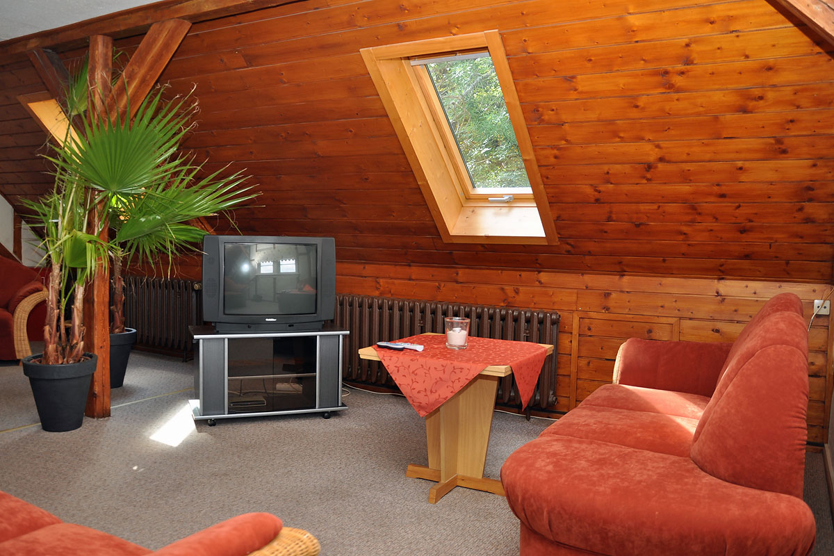Unter unserem Dach befindet sich eine lauschige Stube, die am Abend zum Fernsehen, Brett- oder Billard spielen einlädt.