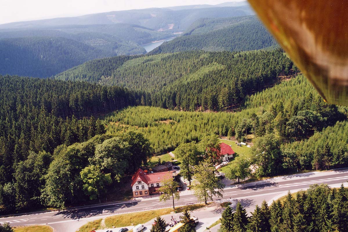 Historie: Im tiefen Mittelalter fuhren bis zu 18 Handelswege über den Thüringer Wald. Überlieferungen zufolge befanden sich bereits um 1540 an dieser Stelle Gebäude, welche einst als Wegzollstelle dienten. Später wurde dieses Haus als Raststätte und Herberge betrieben.