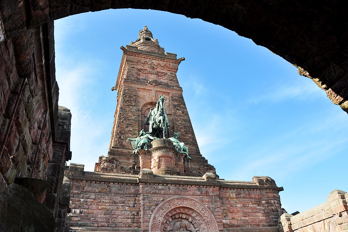 Das Kyffhäuser-Denkmal im Norden von Thüringen wurde zu Ehren des Deutschen Kaisers Wilhelm I. erbaut und zeigt ihn als Reiter vor einem großen Turm. Von der Turmkuppel aus habt ihr einen tollen Ausblick auf die Reste der Reichsburg Kyffhausen sowie bis zum Brocken im Harz.