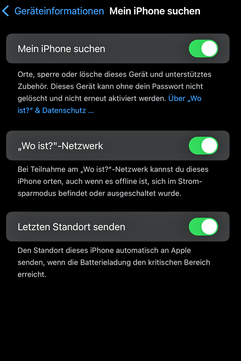 Ferner ist auf Reisen immer die Bluetooth-Verbindung sowie die Funktion zum automatischen Verbinden mit WLAN-Hotspots zu deaktivieren. Das sorgt neben einer längeren Akkulaufzeit ebenfalls für mehr Sicherheit gegen Cyberangriffe. In diesem Kontext ist weiterhin die Aktivierung der Funktionen "Mein iPhone finden" oder "Mein Gerät finden" wichtig. Einmal eingerichtet, können Smartphones auch nach dem Verlust noch geortet werden.