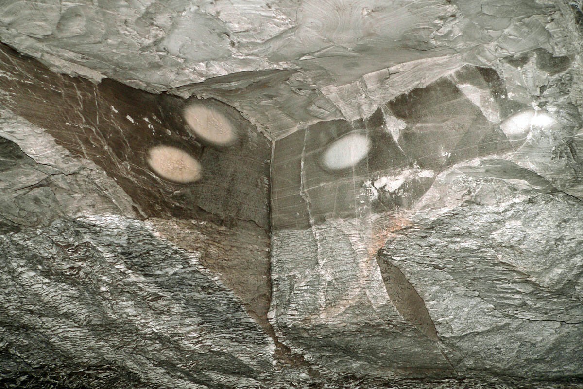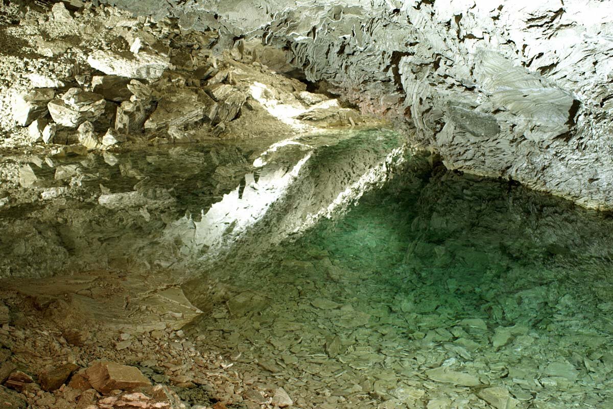 Spektakulär und weltweit einzigartig: In der „Gerberei“ hängen über ein Meter lange, skurril gebogene „Gipslappen“ von der Decke herab, die an zum Trocknen aufgehängte Felle und Häute erinnern. Das Höhlengestein Anhydrit (CaSO4) saugt wie ein Schwamm die hohe Luftfeuchtigkeit auf und wandelt sich dadurch in Gips um. Bei diesem Prozess nimmt das Volumen des Gesteins um etwa 60% zu. Infolge dessen schält sich der vergipsende Anhydrit in bizarr gewölbten Platten von den Wänden der Höhle ab.
