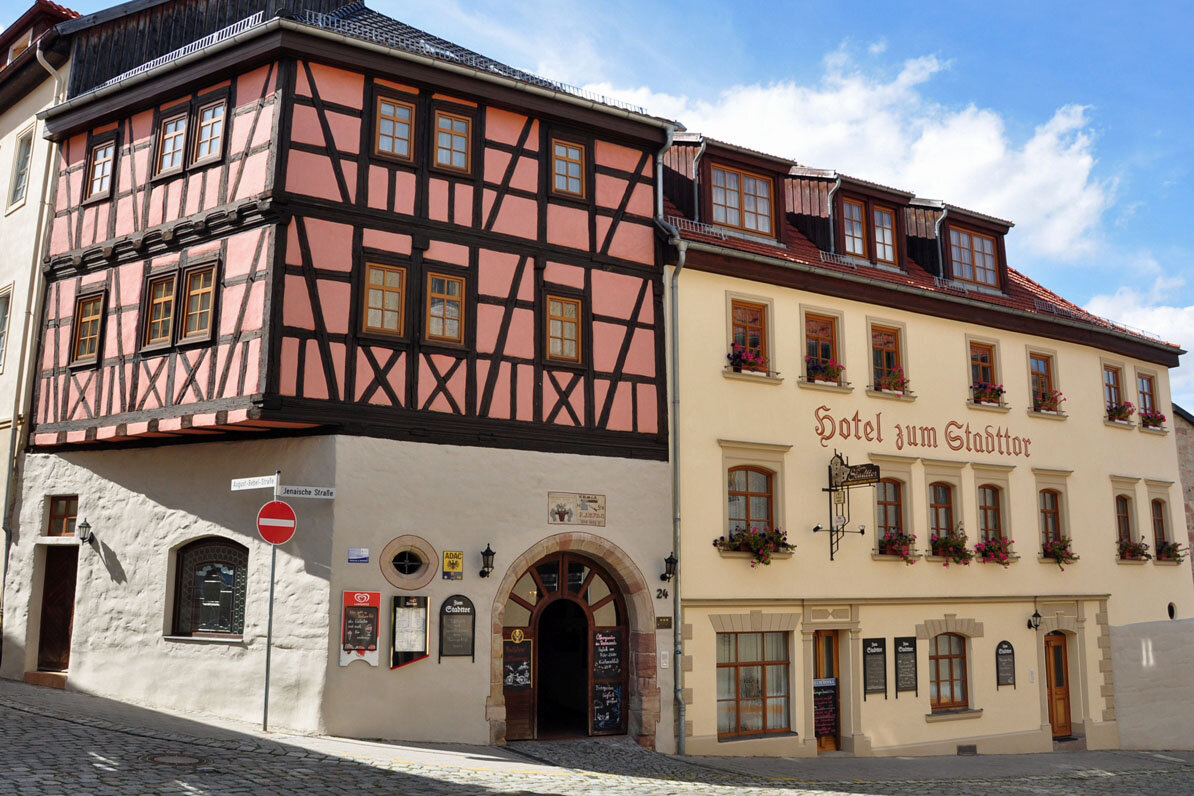 Das Eckhaus August-Bebel-Straße und Jenaische Straße zählt zu den ältesten Häusern der Altstadt. Es besticht durch sein liebevoll restauriertes Fachwerk und ist heute Teil eines Hotels.