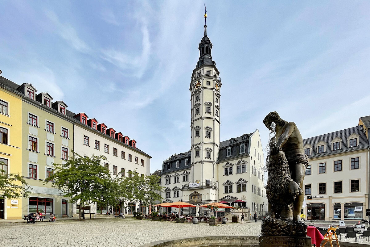 Der dreigeschossige Renaissancebau mit einem reich geschmückten Portal und sechsgeschossigen 57m hohen Treppenturm, wurde 1573-76 errichtet. Nach dem verheerenden Stadtbrand von 1780 wurde es von 1783-84 wieder aufgebaut. Auch erfolgten aufgrund der über Jahrhunderte wachsenden Bevölkerung weitere Anbauten auf dem Kornmarkt. Seit 1988 erklingt in der Turmlaterne das handgespielte Carrilon mit seinen 37 Glocken. Die kleinste Glocke wiegt 12 kg und die größte 80 kg. Seit 2016 wird es vom Förderverein Rechtspflege Kunst und Kultur e.V. gespielt. Sehenswert sind auch die Fresken in der historischen Gaststätte Markt 1, ehemals Ratskeller.