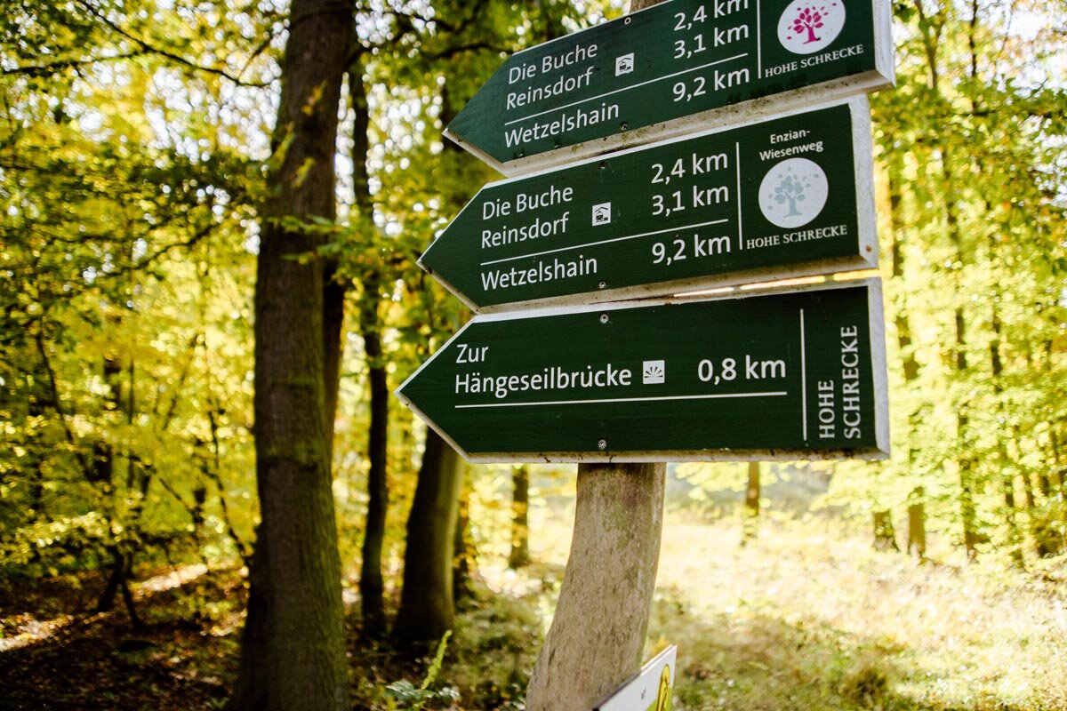 Bei entspannten Tempo ist man ca. 2 Stunden unterwegs. Wenn man auf der anderen Seite der Hängeseilbrücke weiterwandert kann man über den "Kleinen Hohe Schrecke Rundweg" die Runde vollenden. Der kleine Rundweg erstreckt sich über 13 km und führt durch einige der beliebten Wildnisgebiete der Hohen Schrecke.