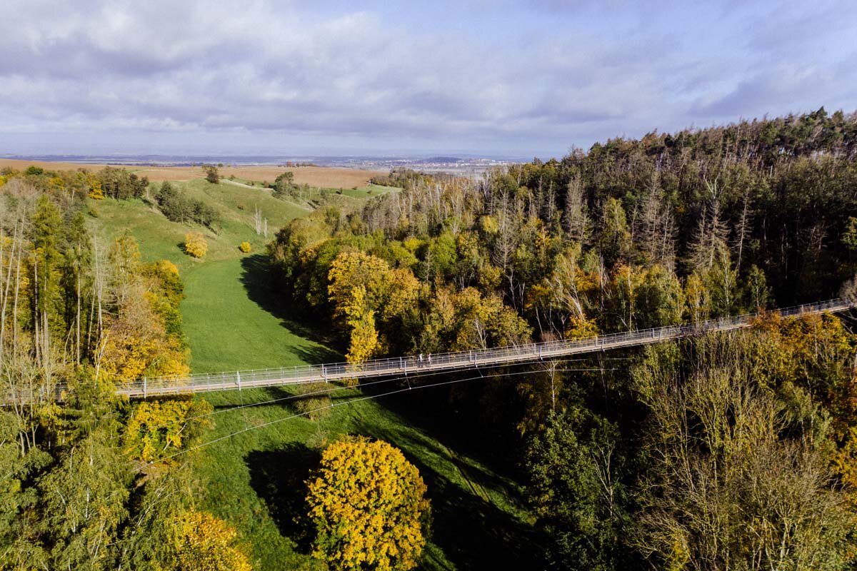180 Meter lang, 85 Zentimeter schmal und 25 Meter über Tal: Die Hängeseilbrücke über das Bärental ist die neue Attraktion in der Hohen Schrecke. Bewusst einfach aus Stahl und Holz konstruiert, ist die Brücke auch Baumkronenpfad und Aussichtspunkt. Sie bricht keine Rekorde, fügt sich stattdessen sanft ein in die sie umgebende Natur.