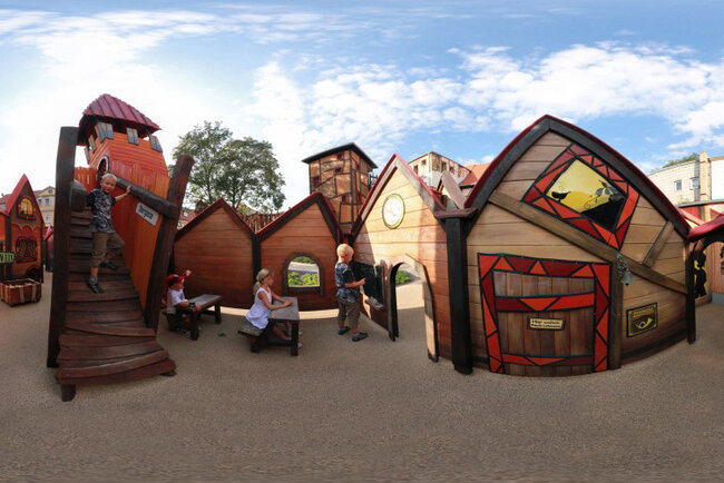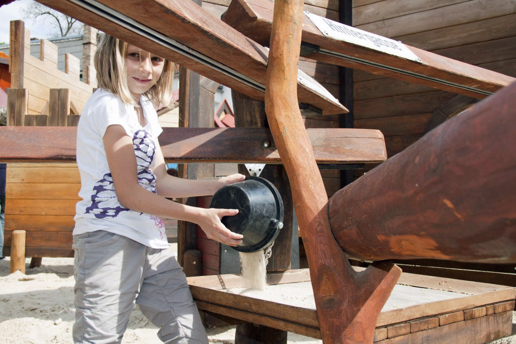 Kinder und Erwachsene tauchen in eine fantasievolle Welt ein, in der sie sich über Netzbrücken zu den Klettertürmen hangeln, die geheimnisvollen Baumhäuser erkunden, rasante Rutschpartien unternehmen oder im Sandbereich spielen. In einer riesigen Puppenstube, im Spielhaus, Schiff, Jeep, Tiergehege mit Holztieren, sowie in der Spielstadt gibt es viele Möglichkeiten, in die verschiedensten Rollen zu schlüpfen.