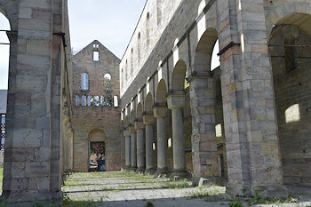 Im Westen sind Reste der dreischiffigen Vorkirche und der früheren Doppelturmanlage erhalten. In der Vorkirche befindet sich das Säulenportal, eines der ersten im deutschsprachigen Raum. Im Bogenfeld ist schemenhaft die Muttergottes mit dem Christuskind als Schutzpatronin des Klosters zu erkennen. Reste von Röteltonzeichnungen zeugen von der figürlichen Bemalung der Bogenläufe. Durch diese ungewöhnliche, offenbar später hinzugekommene Bemalung trat das Portal zum gotischen Skulpturenportal in Konkurrenz, das sich aus Frankreich kommend in ganz Europa verbreitete. Im Seitenschiff der Vorkirche werden Architekturfragmente der Ruine aufbewahrt. Vor dem südlichen Turm steht die romanische Brunnenschale aus dem Kreuzgang des Klosters.
