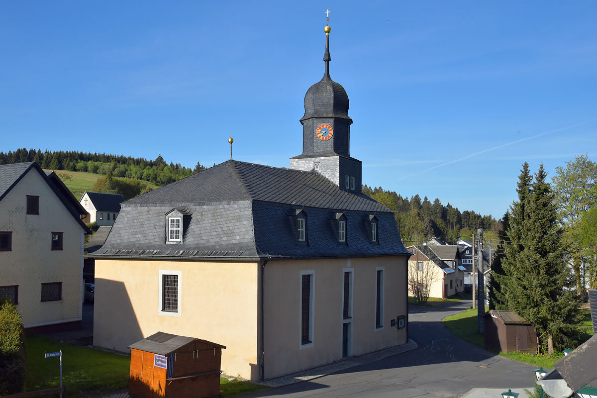 Bereits 1488 wurde in alten Unterlagen eine Holzkirche erwähnt. Sie liegt etwa 200 m in Richtung Oelsetal an der alten Heer- und Handelsstraße Nürnberg-Leipzig und dem Rennsteig. Die jetzige evangelisch-lutherische Kirche wurde im Jahre 1746 an gleicher Stelle erbaut. Die Ausgaben für den Kirchenbau betrugen 1423 Taler, 31 Groschen und 2,5 Pfennige. Sie wurden größtenteils durch Spenden gedeckt.