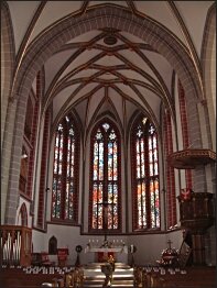 Wir beginnen unseren Rundgang mit dem Blick zum Chorraum. Dabei fallen besonders die neuen Glasfenster ins Auge. Der Berliner Maler Gerhard Olbrich hat sie entworfen, die Glaswerkstätten Franz Lehmann, Berlin- Weißensee, haben sie ausgeführt. 1961 wurden sie in die hohen gotischen Fenster eingebaut. Sie stellen Szenen aus dem letzten Buch der Bibel, der Offenbarung des Johannes dar: Im Mittelfenster erscheint Christus als Weltenrichter im Strahlenkranz ("Mandorla"). Aus dem Mund Christi geht ein Schwert hervor, Symbol für das Wort Gottes. Das Lamm neben ihm hat sieben Augen und sieben Hörner als Zeichen der Stärke und Weisheit; es weist auf den für die Sünden der Menschen geopferten Christus hin. Weiter unten erkennt man die Symbole der vier Evangelisten: Engel - Matthäus, Stier - Lukas, Löwe - Markus, Adler - Johannes. Darunter befreit Michael eine sonnenumstrahlte Frau (Maria auf der Mondsichel), von dem Drachen - Sinnbild für die Bedrängung der Gemeinde. Das linke Fenster zeigt Christus, den lebendigen Herrn, inmitten seiner Gemeinde, repräsentiert durch 24 Älteste (zwölf auf der rechten Fensterseite), die Gott loben und ihn anbeten. Das rechte Fenster schildert das Endgericht: Die Posaunen erwecken die Toten zum Gericht und ewigen Leben.
