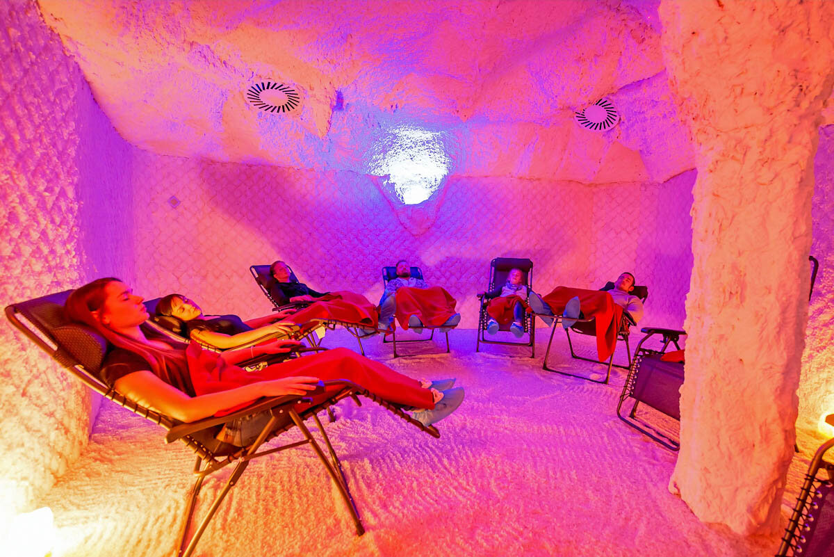Salziger Mini-Urlaub: Naturreine Totes-Meer-Salzziegel vom Toten-Meer wurden an den Wänden und im Fußboden verarbeitet. Dieses Salz verfügt über eine höhere Löslichkeit und reichert die Grotten-Luft an. Ein Aufenthalt in der Grotte ist so erholsam, wie ein kurzer Aufenthalt am Meer.
