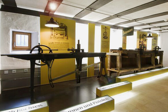 Wesentliche Voraussetzung für die Waffenfertigung in unserer Stadt war die Eisenerzgewinnung. Im Erdgeschoss erhalten Sie Informationen zum Suhler Bergbau sowie einen Einblick in die Arbeitswelt der Schäfter, Systemmacher und Graveure.