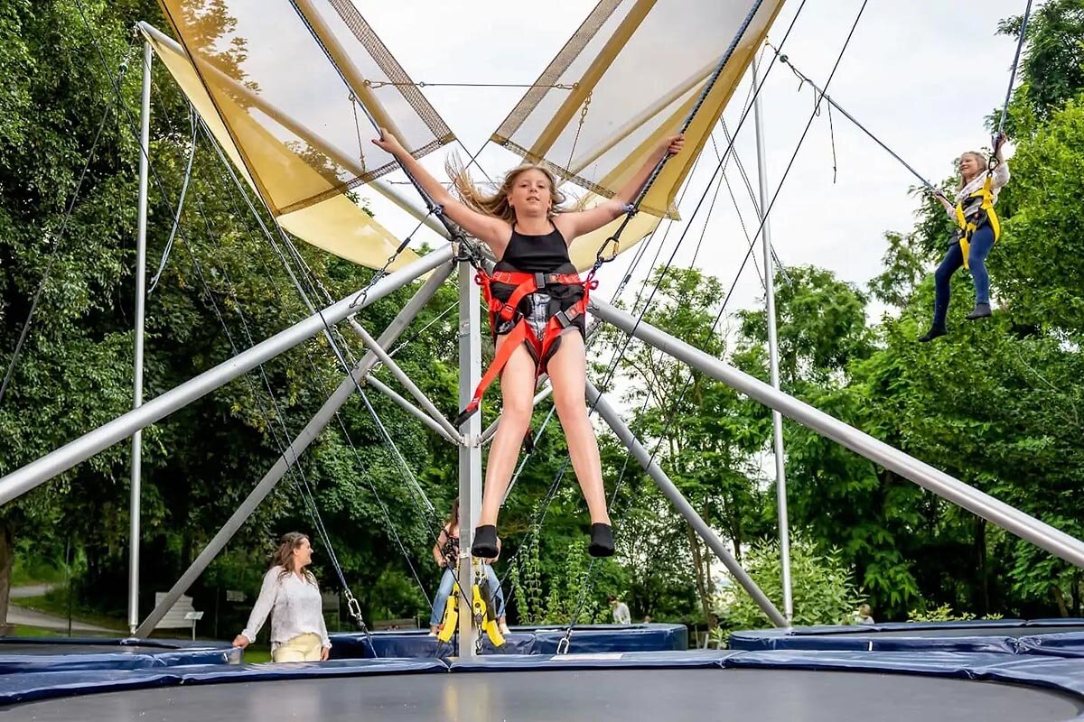 Das Besondere am Bungee-Trampolin: Es ist eine Sportart ganz ohne Risiko. Die Springenden werden in einen sicheren Hüftgurt geschnallt, der in zwei elastische Seile eingehängt wird.