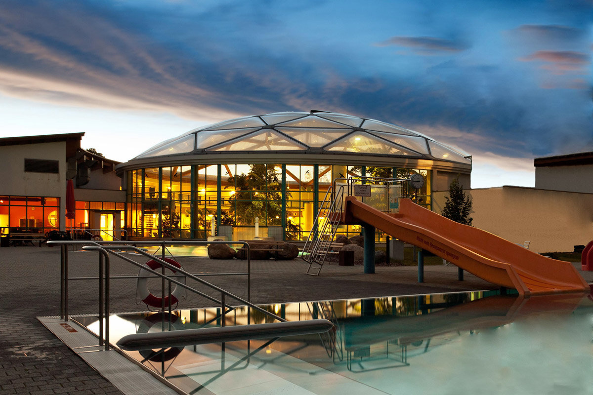 Das direkt an das Erlebnisbecken angeschlossene Ausschwimmbecken, mit ebenfalls 30°C, lädt Sommer wie Winter zum toben oder relaxen ein. Besonders in der kalten Jahreszeit können Sie hier ohne zu frieren bei Schneefall das Winterpanorama genießen!