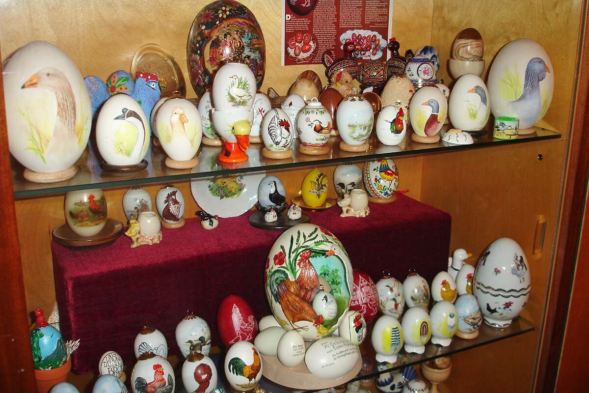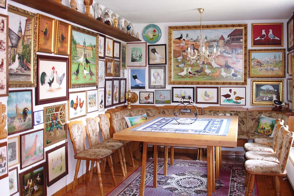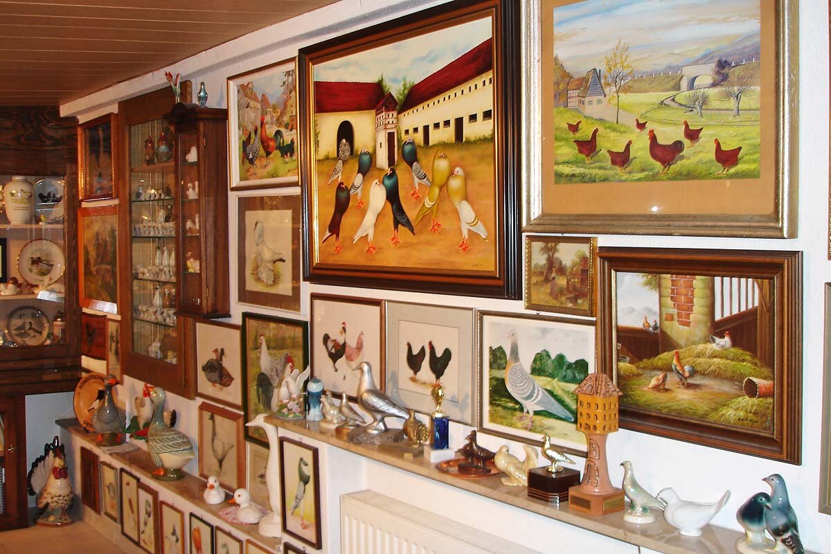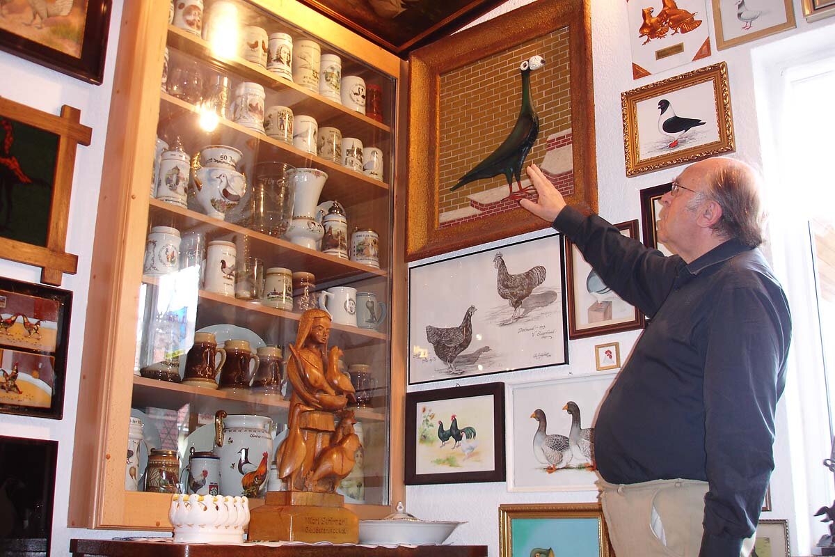 Das Zusammentragen von Antiquarem der Rassegeflügelzucht ist sein großes Hobby geworden. Seit Jahrzehnten sammelt er alles über die Rassegeflügelzucht. Ob Gemälde, Zeichnungen, Skulpturen, Urkunden, Pins, Medaillen oder Porzellan, viele seiner Exponate geben die Geschichte aus vergagenen Zeiten wieder.