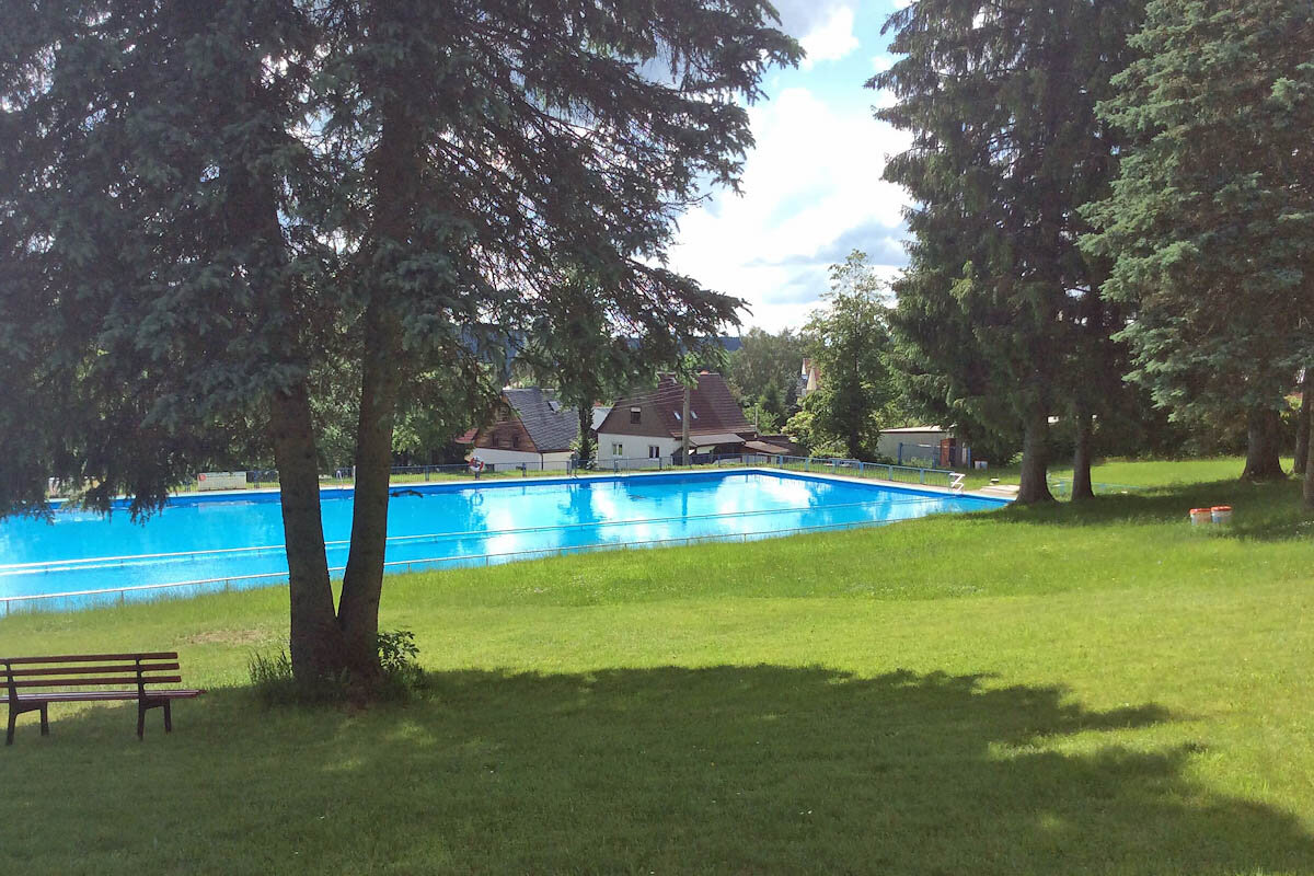 Das Waldbad / Freibad in Goldlauter-Heidersbach, hat seinen Namen zu recht. Es liegt etwas hanglagig auf ca. 630 m NN am Ortsrand von Suhl-Heidersbach und doch mitten in der Natur. Durch seine südwestliche Hanglage hat das Bad fast ganztägig Sonnenschein, aber durch seinen alten Baumbestand auch schattige Plätzchen.