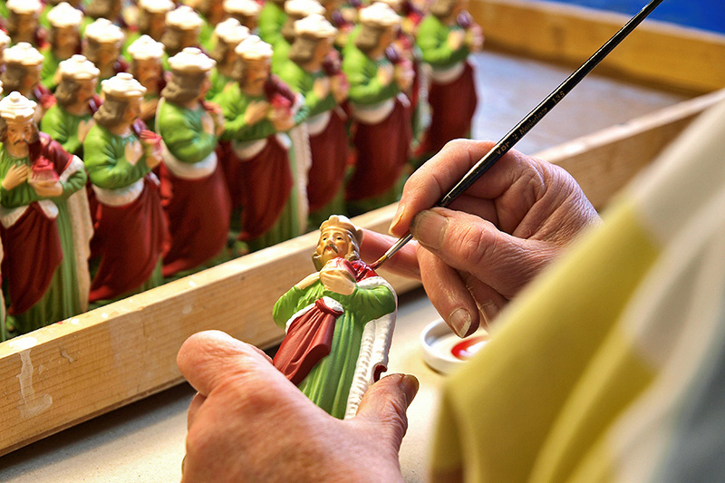 Die Oberflächen der fertig aufgestellten Figuren werden zunächst in einem Leimbad egalisiert, um einen gleichmässigen Farbauftrag zu gewährleisten. Anschließend werden die großen Flächen, wie Kleider und Hosen, mit feinen Airbrushpistolen farblich gestaltet. Danach verleihen meisterliche Maler den Figuren Ausdruck und Lebendigkeit. Eine abschließend sorgfältig aufgebrachte Patina verstärkt den Eindruck von Plastizität und Tiefe. Vollendet werden die Figuren durch das Aufbringen diverser Golddekore.
