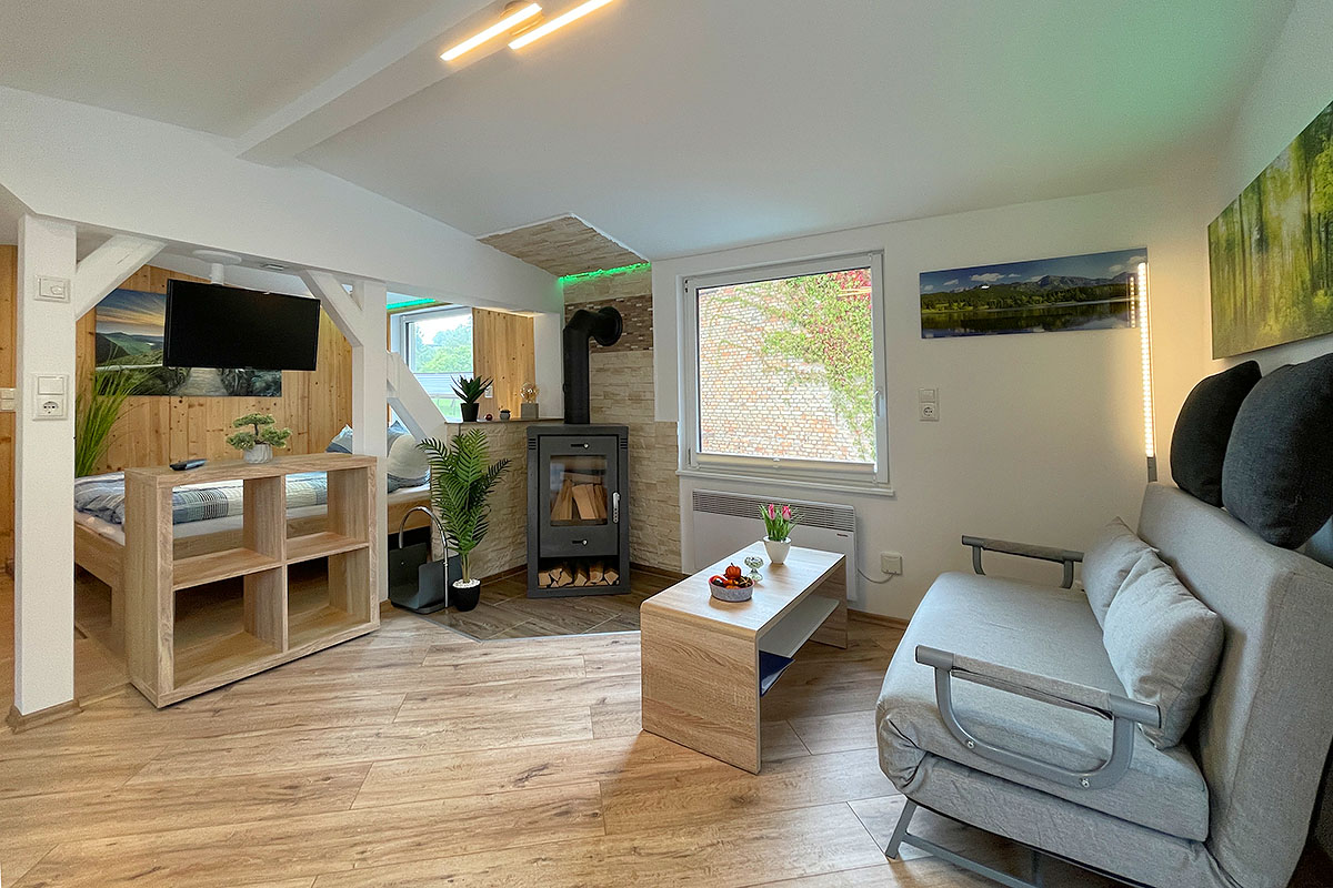 Neu eingerichtetes Appartement (ca. 35 m² ) in Gräfenroda für 2 bis 4 Monteure / Arbeiter; Wohnbereich mit Couch, TV und Kamin; gut ausgestattete Miniküche; Schlafbereich inkl. Kleiderschrank; WLAN vorhanden; Parkplatz mit E-Ladesäule (Lage: Ilmkreis)