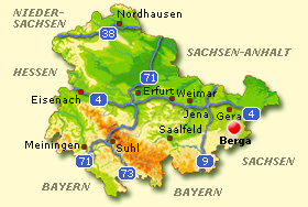 Die Bergaer Burg – bereits frühzeitig als Ritterburg genutzt - erhebt sich nördlich der Stadt auf einem Bergsporn und ist derart von der Bewaldung umschlossen, dass sie darin nahezu verschwindet. Leider fiel das „Bergaer Schloss“ 1994 einem verheerenden Brand zum Opfer.