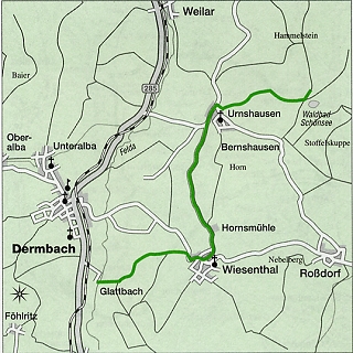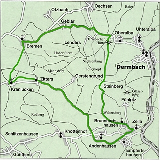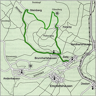 Barockkirche Zella, Backhaus Brunnhartshausen (Backspezialitäten aus dem Steinbackofen, an jedem 2.Wochenende eines jeden Monats Backtag) Kirche in Brunnhartshausen, Gläserberg, Schutzhütte des Rhönclubs, (Ausblick zur Hohen Rhön, dem Thüringer Wald und der Wartburg), Einkehrmöglichkeiten beim "Hobbywirt" Föhlritz, Dorfbrunnen Föhlritz (15.Jh.) Kreuze und Bildstöcke auf der Wegstrecke