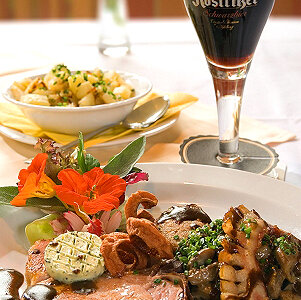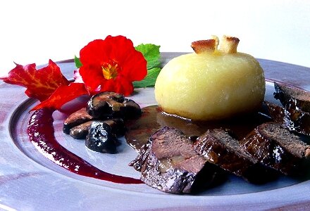 Genießen Sie gespickten Rehrücken mit Waldpilzen, Wacholderrahmsoße und Preiselbeerrahm, dazu "Schmiedefelder Knölle" (Thüringer Klöße).