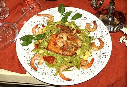 Probieren Sie das Rezept für Sahnetagliatelle mit Knoblauch Basilikum zu in Olivenöl geschwenkten Garnelen für 4 Personen.