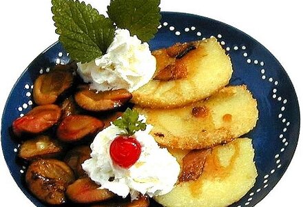 ... in dunkler Zuckersoße, mit heißen Pflaumen und Sahnedekor