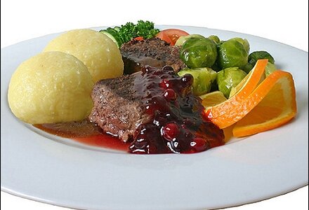 Leckere Hirschmedaillons mit Thüringer Klößen, Rosenkohl, Preiselbeeren und Sahne. Ein Rezept vom Küchenchef Frank Junge, Kurhotel Auerhahn am Rennsteig.