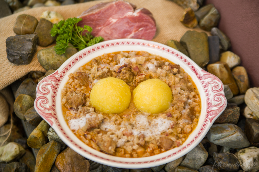 Das in gulaschgroße Würfel geschnittene Schweinefleisch wird mit einem Teelöffel grob gehacktem Kümmel, Salz und Paprikapuder kräftig gewürzt und zum Ansatz zugegeben. Es sollte im eigenen Saft gar dünsten.