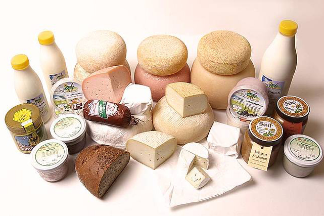 Joghurt, Frischkäse, Hirtenkäse, Schäferstunde, Rheinsberger, Schnittkäse Natur oder mit saisonal wechselnden Kräutern, z.B. „Morgenröte“ mit Thymian und Rote Beete oder „Sommerabend“ mit Tomate und Kräutern sowie unser Klassiker: Blauschimmel + Alt Siegelbach