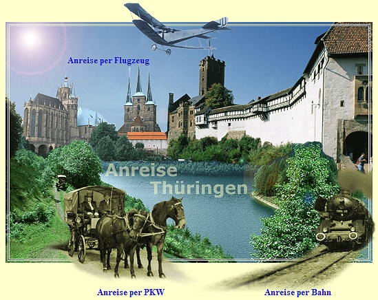 Durch die die zentrale Lage Thüringens, in der Mitte Deutschlands, können Sie Ihren Urlaubsort schnell und bequem per PKW, Bahn oder Flugzeug erreichen. Die nachfolgende Skizze führt Sie per Link`s zum Online-Routenplaner map 24, zur Fahrplanauskunft der Deutschen Bahn AG sowie zur Internetseite des Flughafen Erfurt-Weimar.